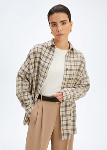 Модель свободного силуэта из плотного хлопка в клетку с отложным воротником, манжетами и накладным карманом.