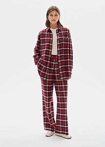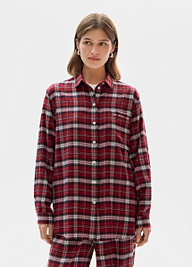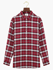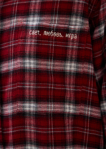 Рубашка в клетку из вискозы в бордовом оттенке. Модель свободного силуэта выполнена с отложным воротником, с накладным карманом с авторской вышивкой "Свет. Любовь. Игра." Изделие хорошо держит форму, сохраняет свой первоначальный вид в течение длительного времени. Рубашка застегивается на пуговицы в тон цвета ткани.