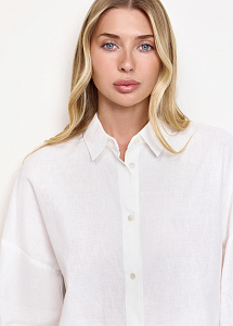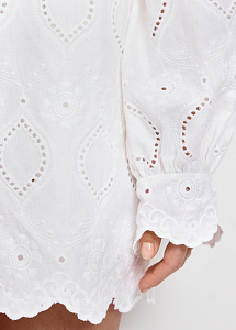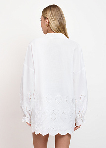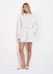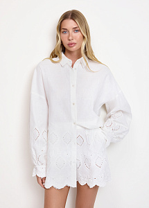 Рубашка из хлопка и льна с вышивкой ришелье. Модель прямого силуэта, с воротником-стойкой, длинными рукавами на манжетах и застежкой на пуговицы. Рубашка станет идеальным выбором для летних дней в городе или отпуска. Рекомендуем сочетать с шортами или юбкой из аналогичной ткани из нашей коллекции.