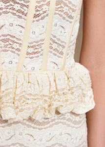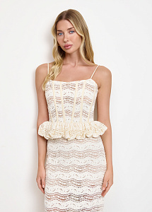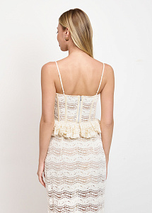Корсетный топ на бретелях с баской. Модель выполнена из кружева с цветочными мотивами. Топ станет идеальным выбором для летних дней в городе или отпуска. Рекомендуем сочетать с юбкой из аналогичной ткани из нашей коллекции.