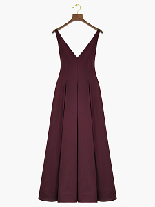 Приталенная модель с расклешённой юбкой выполнена из плотной вискозной ткани с лёгким благородным блеском. Глубокие V-образные вырезы спереди и на спинке подчёркивают линию декольте и плеч. Потайная молния сохраняет чистоту кроя.
