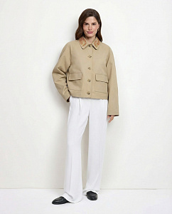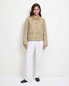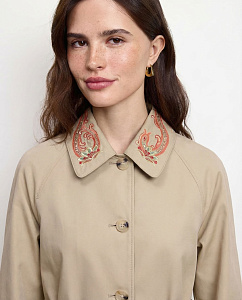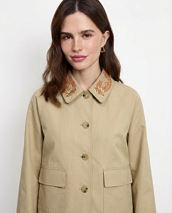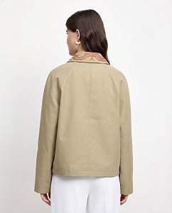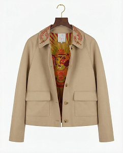 Куртка из плотного хлопка с отложным воротником, длинными рукавами, накладными карманами, застежкой на петли и пуговицы. Модель дополнена авторской вышивкой на воротнике и подкладкой из нежной вискозы, на которых изображен Кетцалькоатль, пернатый змей, главный бог ацтекского пантеона, — архетип духовного пути и внутренней трансформации.