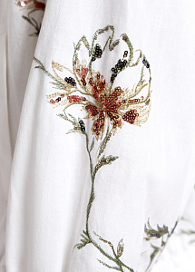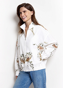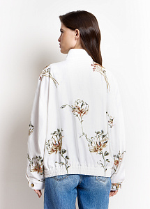 Бомбер из хлопка и льна молочного оттенка с пайетками и цветочной вышивкой. Модель на молнии, с воротником-стойкой, манжетами, эластичным нижнем краем и шёлковой подкладкой для исключительного комфорта. Рекомендуем сочетать с моделями из аналогичной ткани из нашей коллекции.