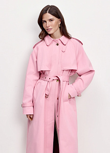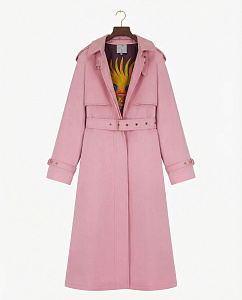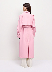 Плащ-тренч прямого силуэта из хлопка светло-розового цвета. Плотная ткань хорошо держит форму и защищает от ветра в прохладные дни. Модель со съёмным поясом, карманами, воротником-стойкой и подкладкой из нежной вискозы с авторским принтом.