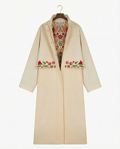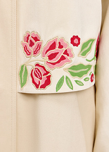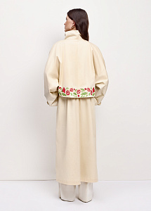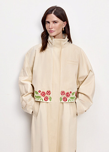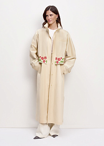 Плащ прямого силуэта из плотного хлопка молочного оттенка с вышивкой «Розы», круглым воротником-стойкой и карманами. Съёмный пояс позволяет регулировать посадку, а шлица сзади обеспечивает свободу движений. Рекомендуем сочетать с брюками и платьями из нашей коллекции.
