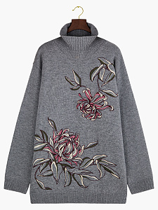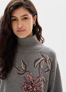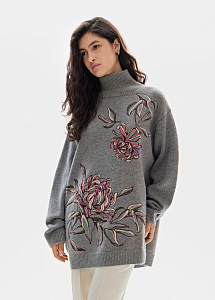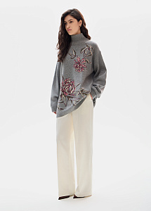 Модель расслабленного силуэта с высокой горловиной и контрастной вышивкой "Георгины". Идеальный выбор для прохладных вечеров — рекомендуем сочетать с брюками или юбками из нашей коллекции.
