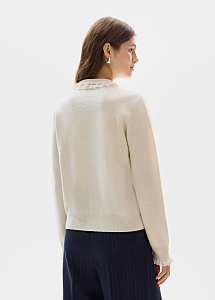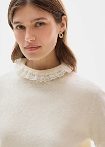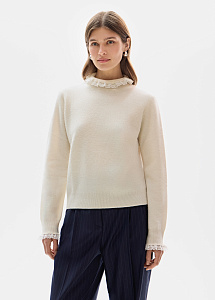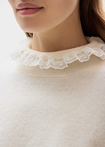 Лаконичный джемпер прямого силуэта в молочном оттенке выполнен из мягкой натуральной шерсти. Изящное кружево на воротнике и рукавах добавляет деликатные женственные акценты.