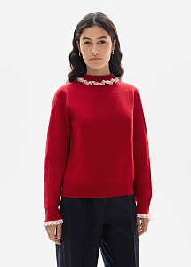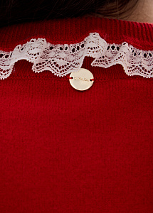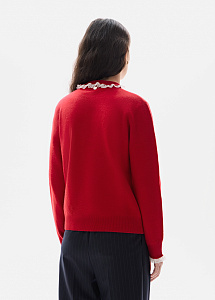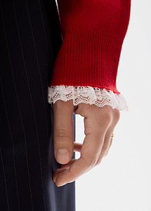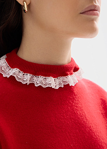 Лаконичный джемпер прямого силуэта в красном оттенке выполнен из мягкой натуральной шерсти. Изящное кружево на воротнике и рукавах добавляет деликатные женственные акценты.