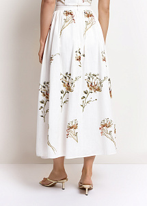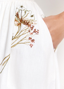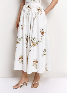 Юбка-миди расклешённого кроя из хлопка и льна молочного оттенка. Модель украшена цветочной вышивкой и россыпью пайеток. Мягкая сборка на талии, пояс и силуэт юбки подчёркивают романтичный стиль, а шёлковая подкладка обеспечивает исключительный комфорт.