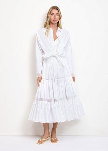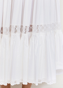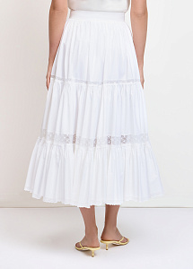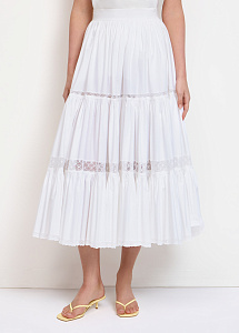 Юбка из натурального хлопка в белом цвете. Модель с мягкими складками по линиям ярусов и кружевом, с поясом. Застежка на потайную молнию в левом боковом шве. Рекомендуем сочетать с рубашкой из аналогичной ткани из нашей коллекции.