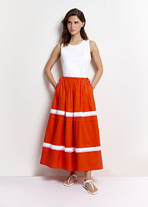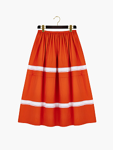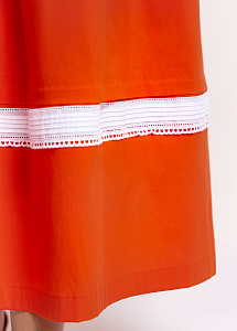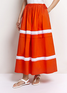 Юбка свободного силуэта в ярком оранжевом оттенке. Модель из трёх ярусов создаёт эффект лёгкой, воздушной многослойности. Дизайн дополнен декоративным кружевом и застроченными складками, которые добавляют текстуру и динамику. Удобный пояс на эластичной тесьме со шнурком позволяет регулировать посадку, а прорезные карманы в боковых швах делают юбку практичной.