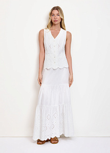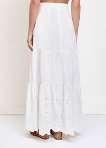 Длинная юбка из хлопка и льна с вышивкой ришелье. Модель из трех сосборенных ярусов, с поясом и застежкой на потайную молнию. Юбка станет идеальным выбором для летних дней в городе или отпуска. Рекомендуем сочетать с жилетом или рубашкой из аналогичной ткани из нашей коллекции.