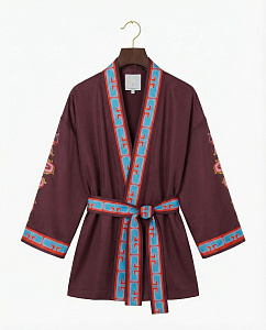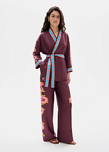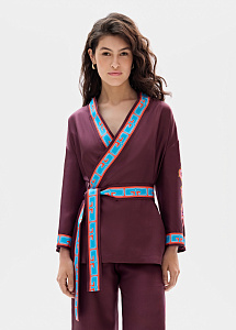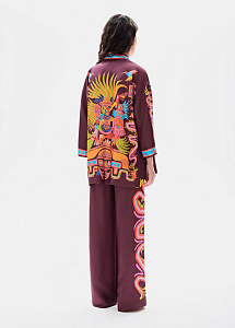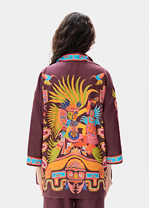 Жакет - кимоно из натурального шелка сливового цвета с авторским принтом, на котором изображен Кетцалькоатль, пернатый змей, главный бог ацтекского пантеона, — архетип духовного пути и внутренней трансформации.